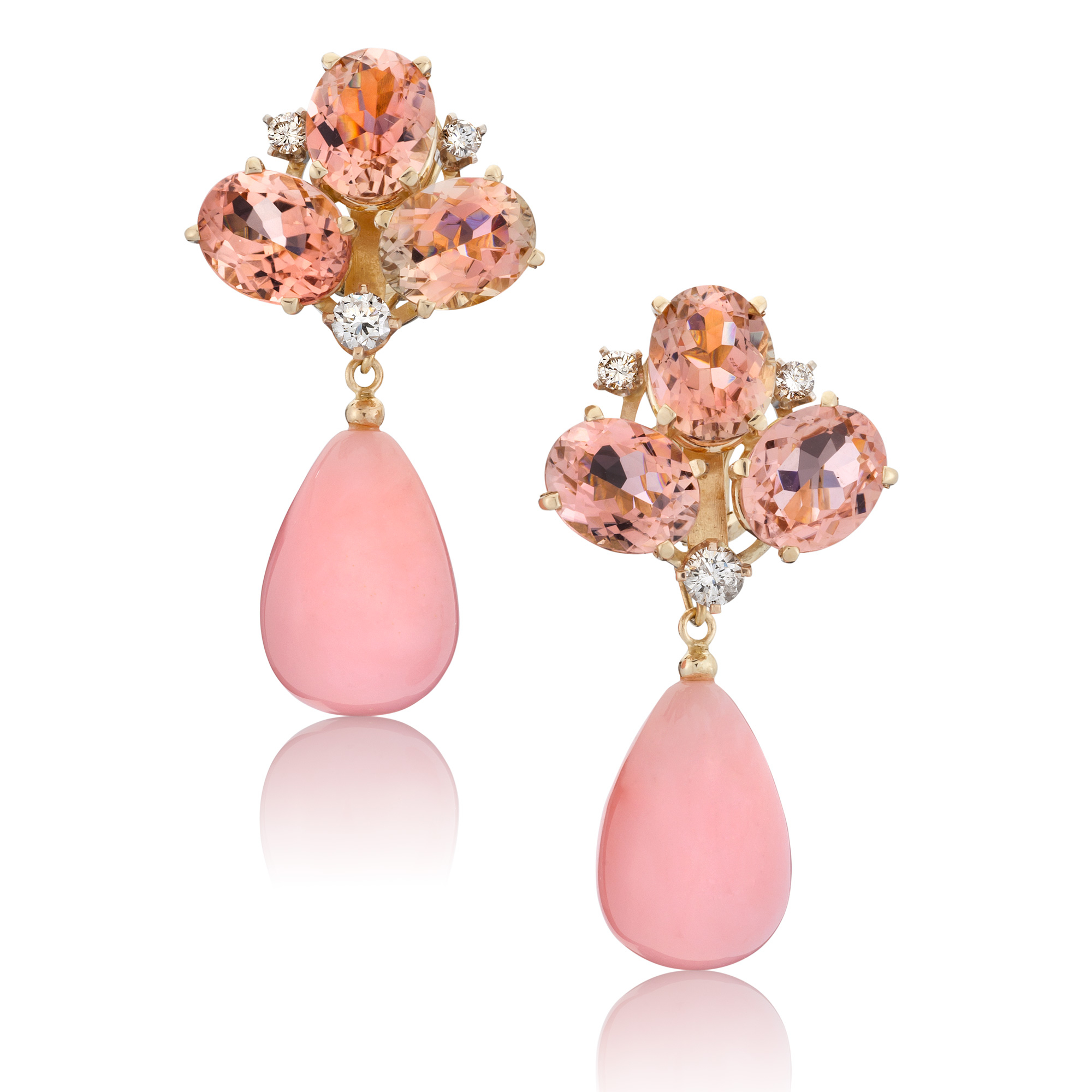 Watermelon tourmaline and diamond . earrings. OTHER. Description: Elegant earrings featuring Oregon Opal (Opal 33.91 total carat . weight) drops carved by Sean Davis, gold with green amethyst and pink tourmaline Designer: India Hicks Fine Jewelry ... Read Content